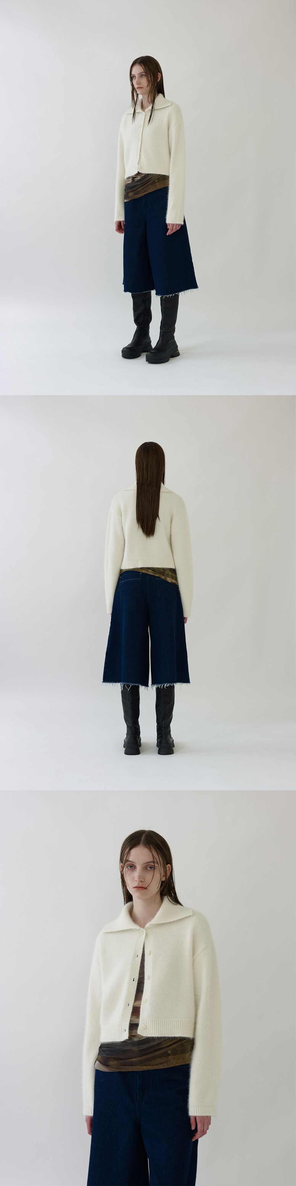와이드 카라 디테일이 돋보이는 여유로운 실루엣의 앙고라 가디건입니다.