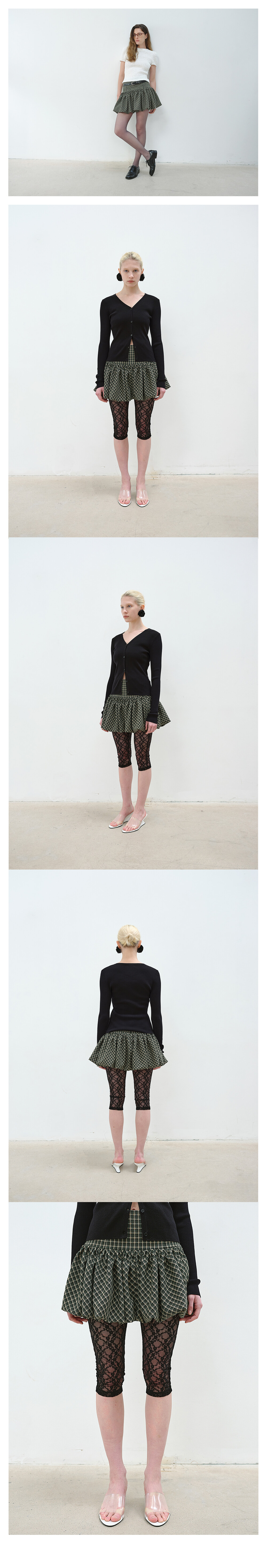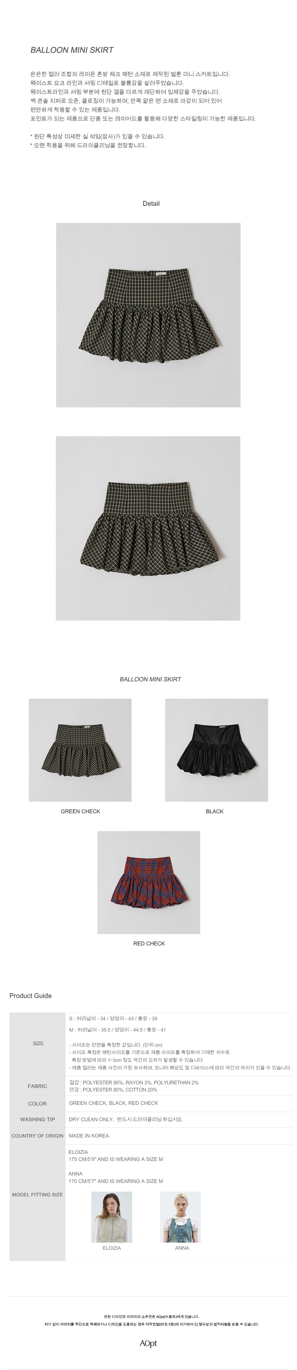 은은한 컬러 조합의 레이온 혼방 체크 패턴 소재로 제작된 벌룬 미니 스커트입니다.