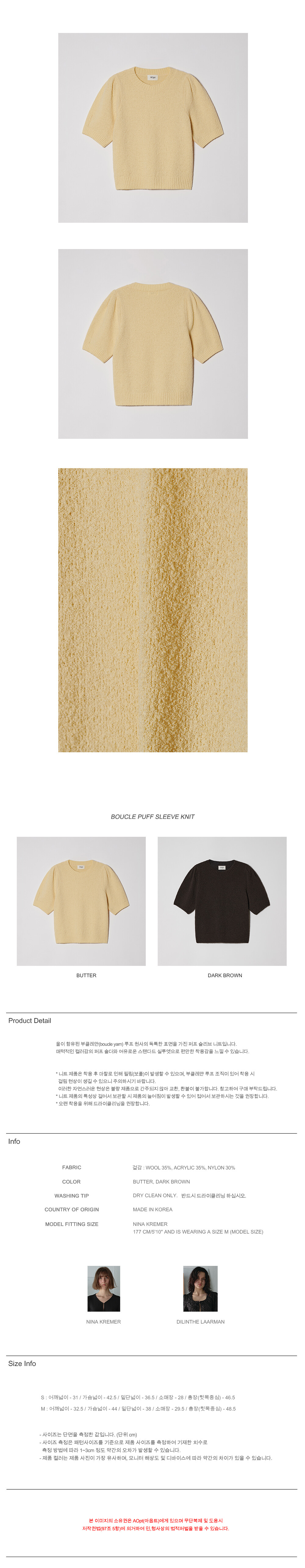 울이 함유된 부클레얀(boucle yarn) 루프 원사의 독특한 표면을 가진 퍼프 슬리브 니트입니다.