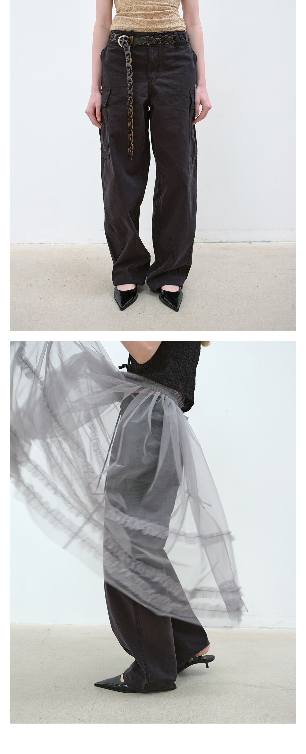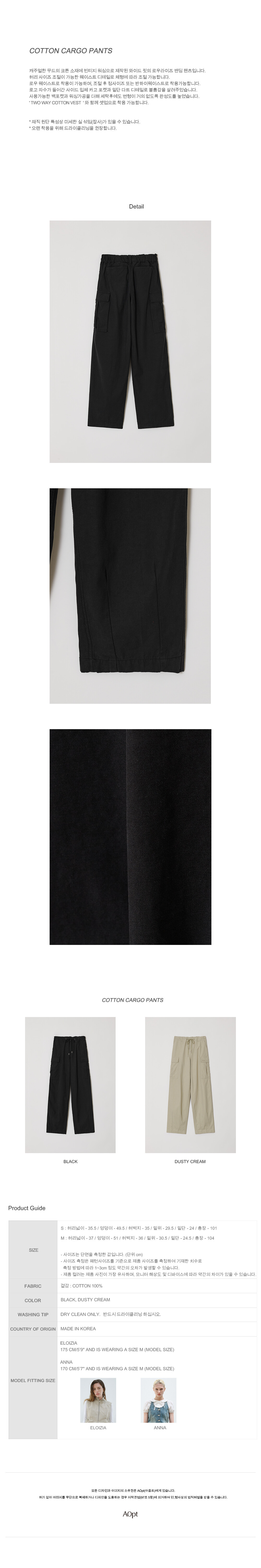 로고 자수가 들어간 사이드 입체 카고 포켓과 밑단 다트 디테일로 볼륨감을 살려주었습니다.
