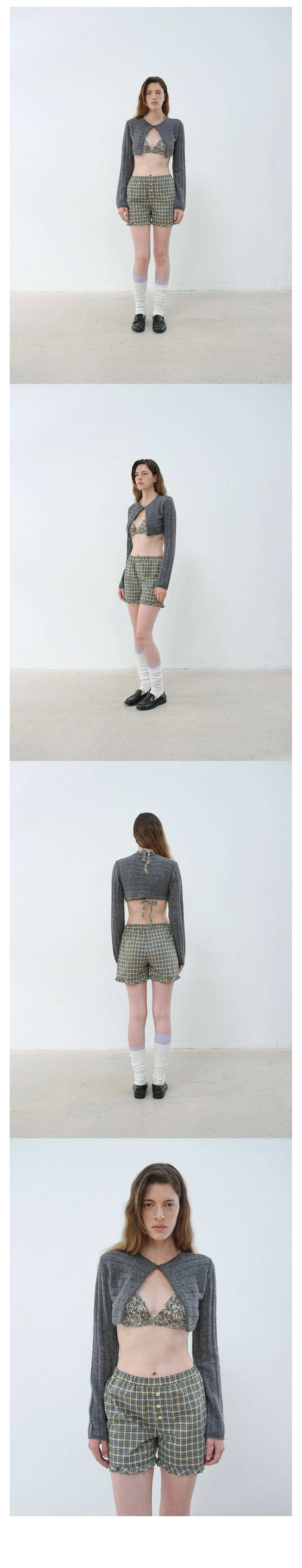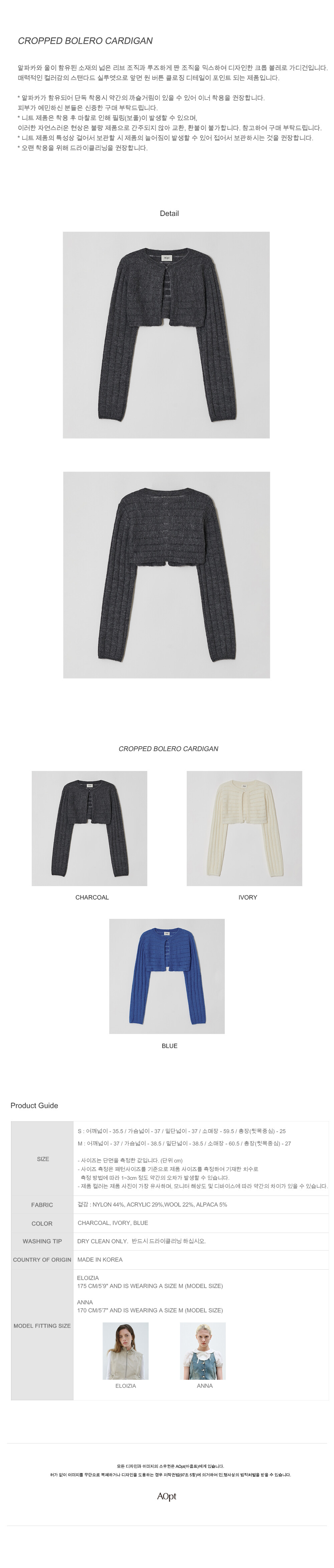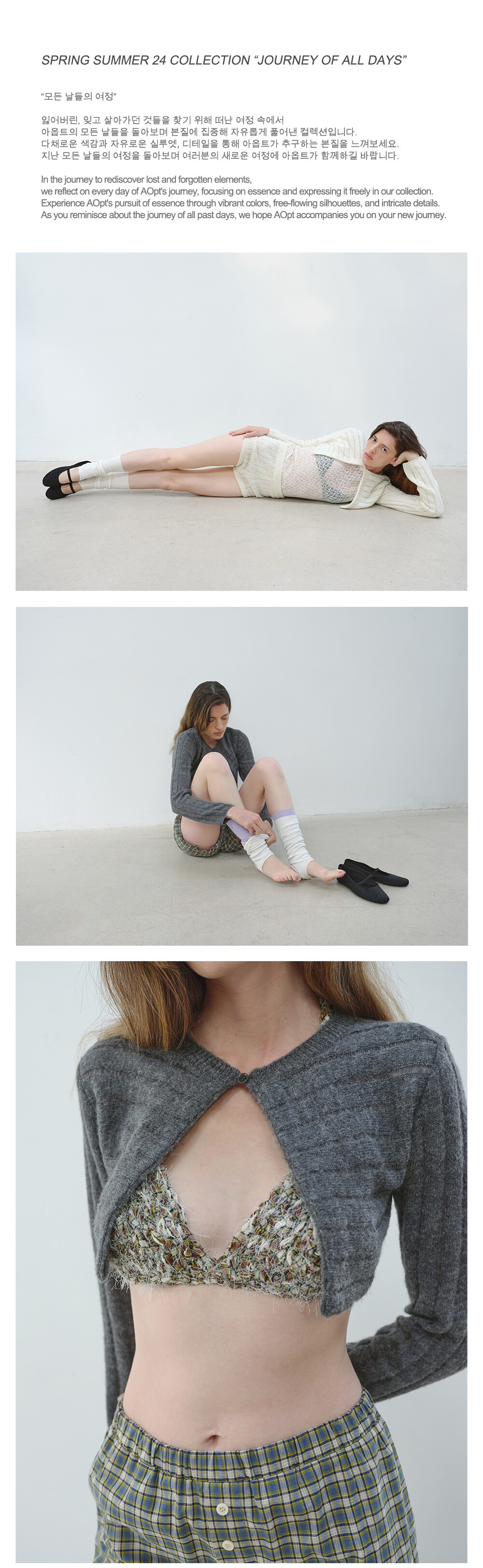 알파카와 울이 함유된 소재의 넓은 리브 조직과 루즈하게 짠 조직을 믹스하여 디자인한 크롭 볼레로 가디건입니다.