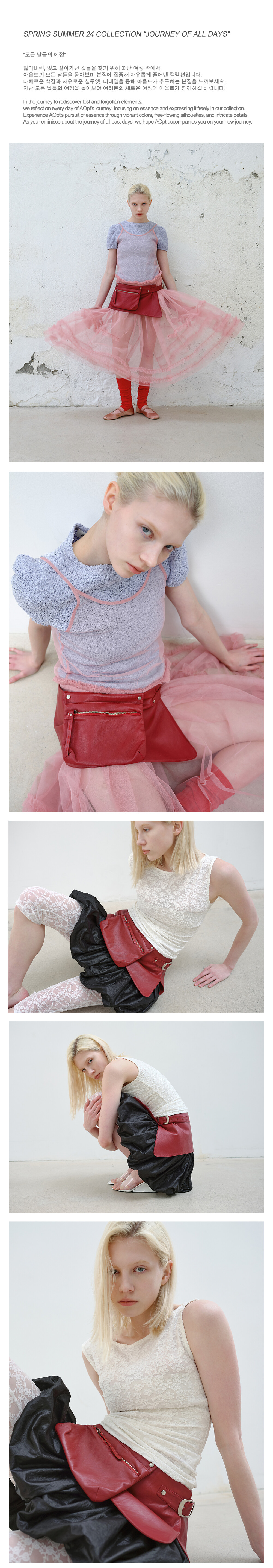 소지품 수납이 가능한 이중 포켓으로 구성 되어있으며, 앞 포켓의 지퍼 여밈, 뒤 포켓의 스냅버튼으로 완성도를 높였습니다.