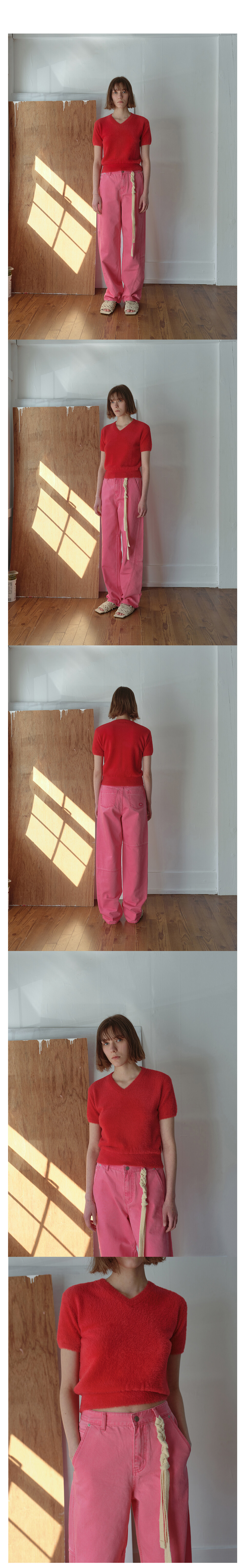 HAIRY V-NECK SHORT SLEEVE KNIT - RED