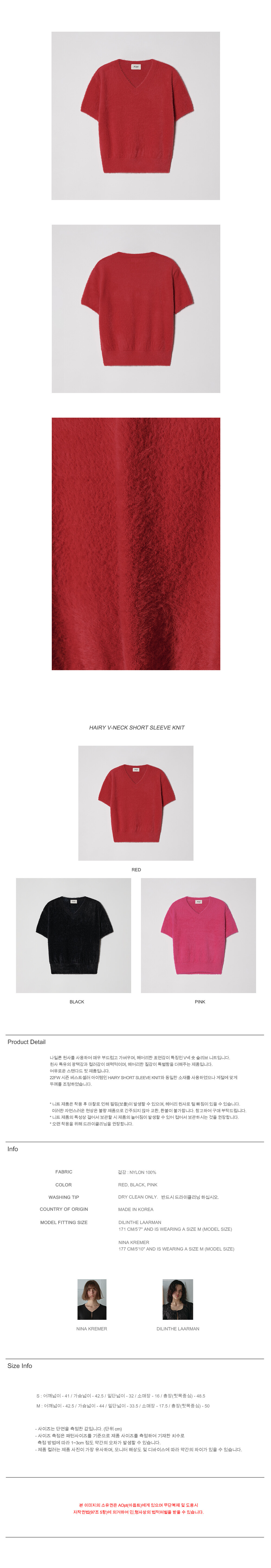 나일론 원사를 사용하여 매우 부드럽고 가벼우며, 헤어리한 표면감이 특징인 V넥 숏 슬리브 니트입니다.