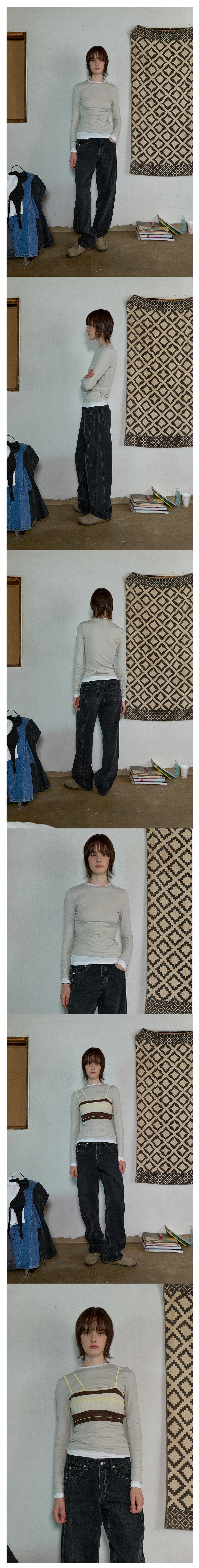 얇은 소재로 서로 다른 컬러를 레이어드하기 용이해 다양한 스타일링이 가능한 제품입니다.