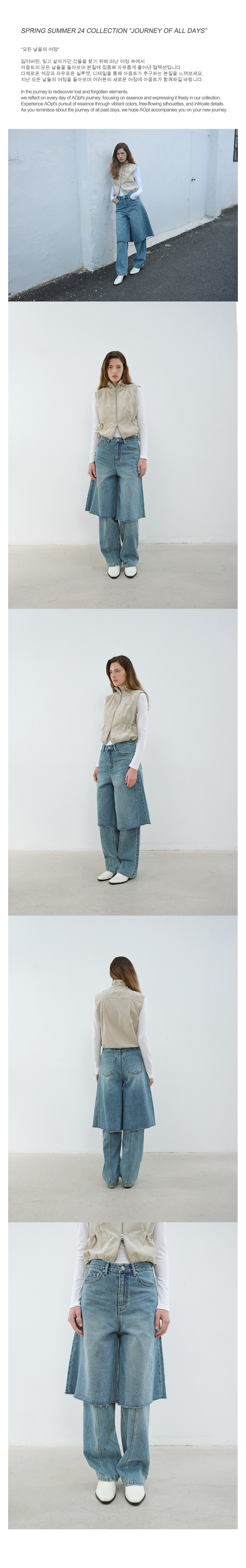 로우 라이즈의 와이드한 실루엣과 종아리까지 오는 기장감에 밑단 부분을 로우컷팅으로 마감하였습니다.