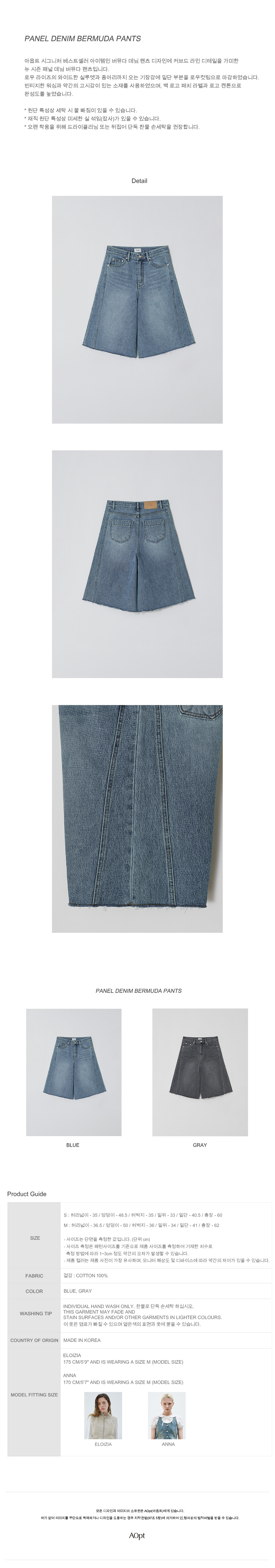 아옵트 시그니처 베스트셀러 아이템인 버뮤다 데님 팬츠 디자인에 커브드 라인 디테일을 가미한 뉴 시즌 패널 데님 버뮤다 팬츠입니다.