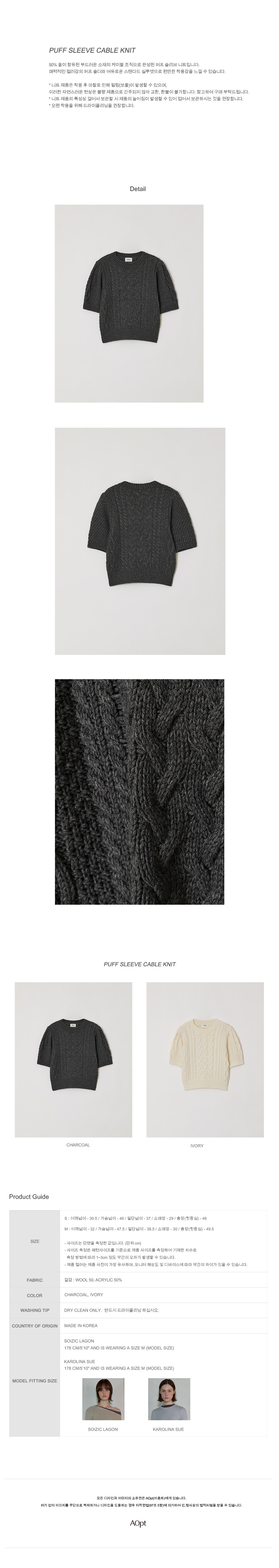50% 울이 함유된 부드러운 소재의 케이블 조직으로 완성된 퍼프 슬리브 니트입니다.