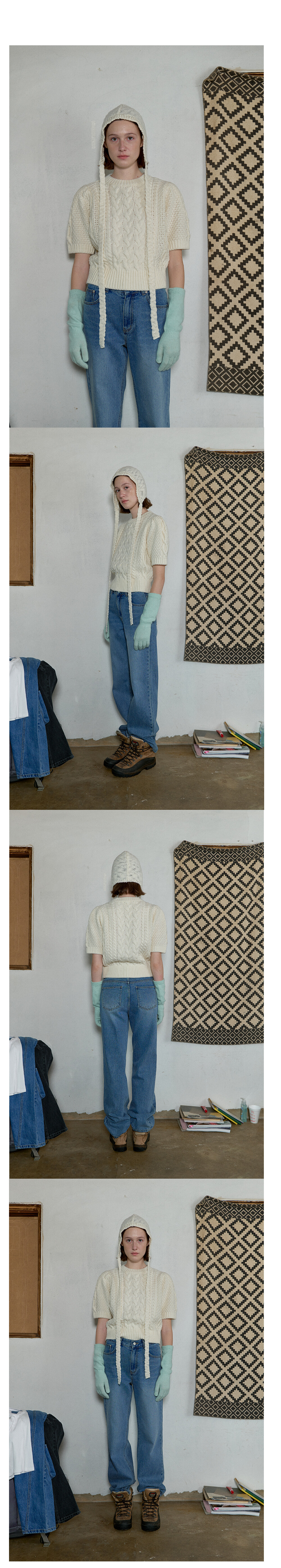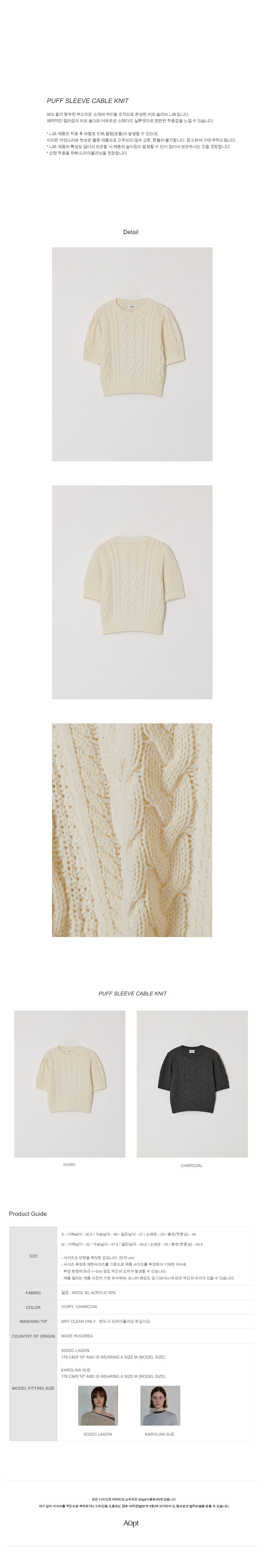 50% 울이 함유된 부드러운 소재의 케이블 조직으로 완성된 퍼프 슬리브 니트입니다.