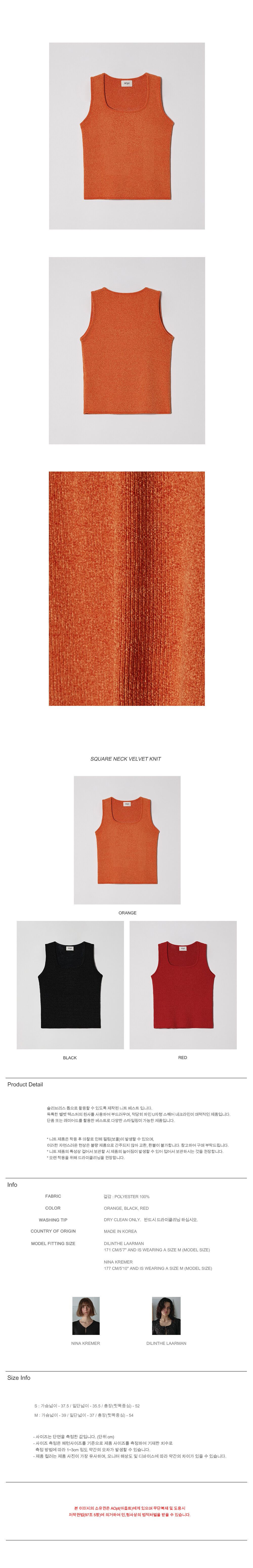 독특한 벨벳 텍스처의 원사를 사용하여 부드러우며, 적당히 파인 U자형 스퀘어 네크라인이 매력적인 제품입니다.