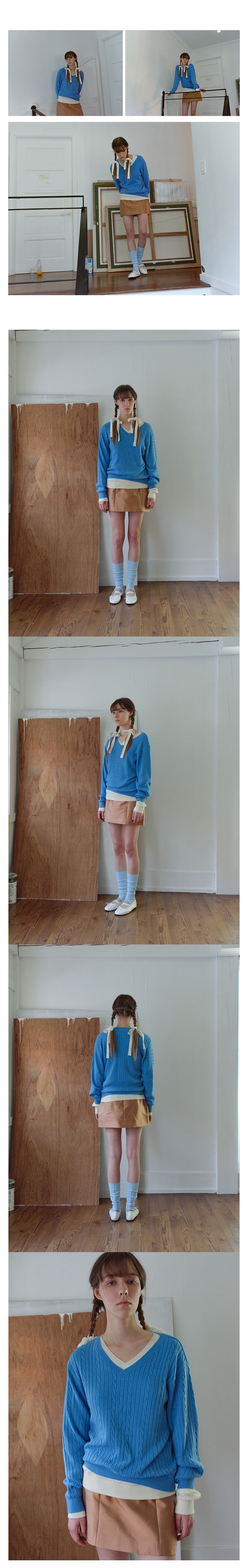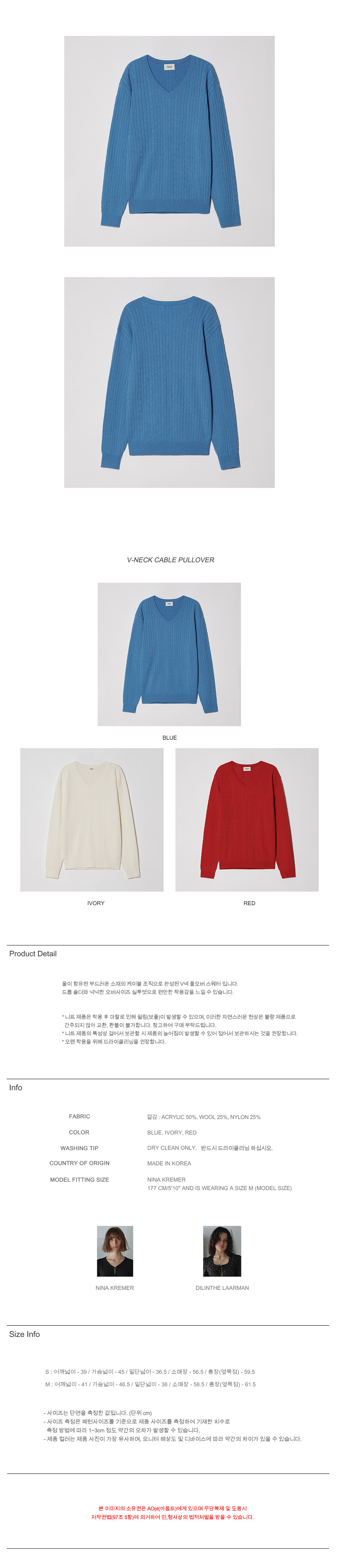 울이 함유된 부드러운 소재의 케이블 조직으로 완성된 V넥 풀오버 스웨터 입니다.