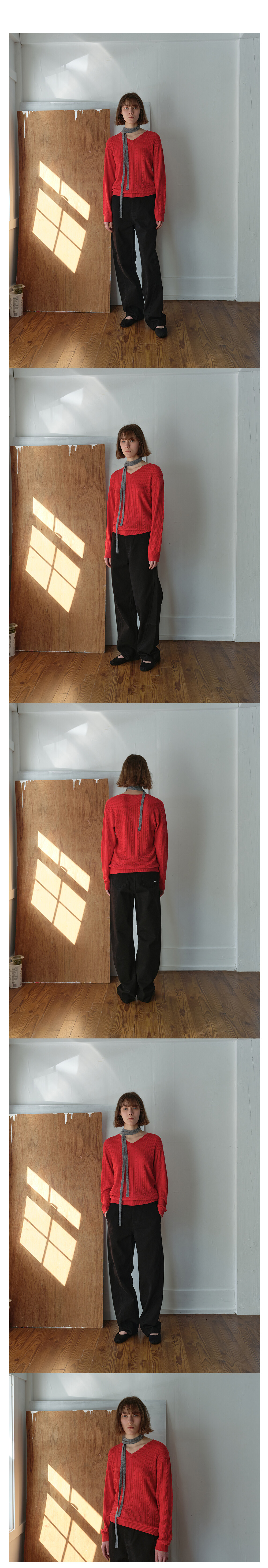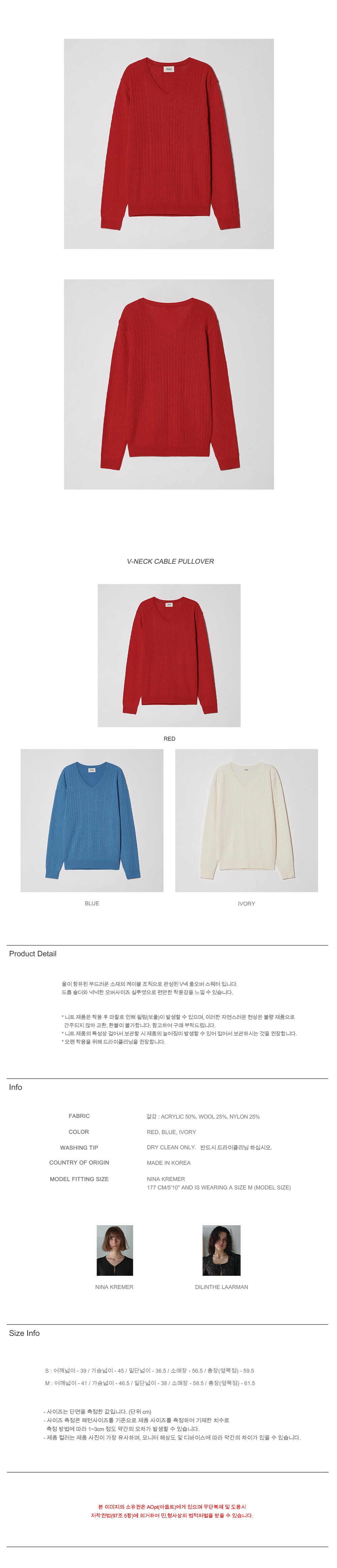 울이 함유된 부드러운 소재의 케이블 조직으로 완성된 V넥 풀오버 스웨터 입니다.
