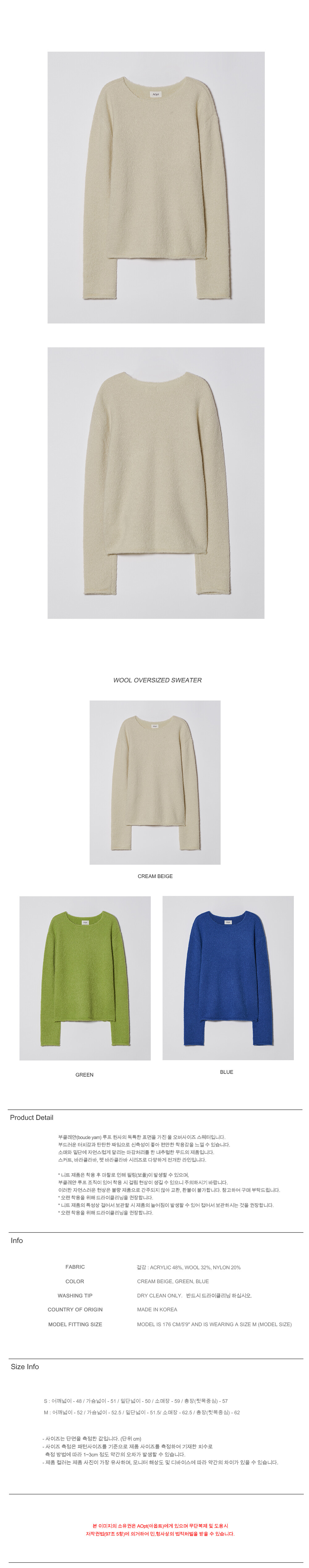 부클레얀(boucle yarn) 루프 원사의 독특한 표면을 가진 울 오버사이즈 스웨터입니다.